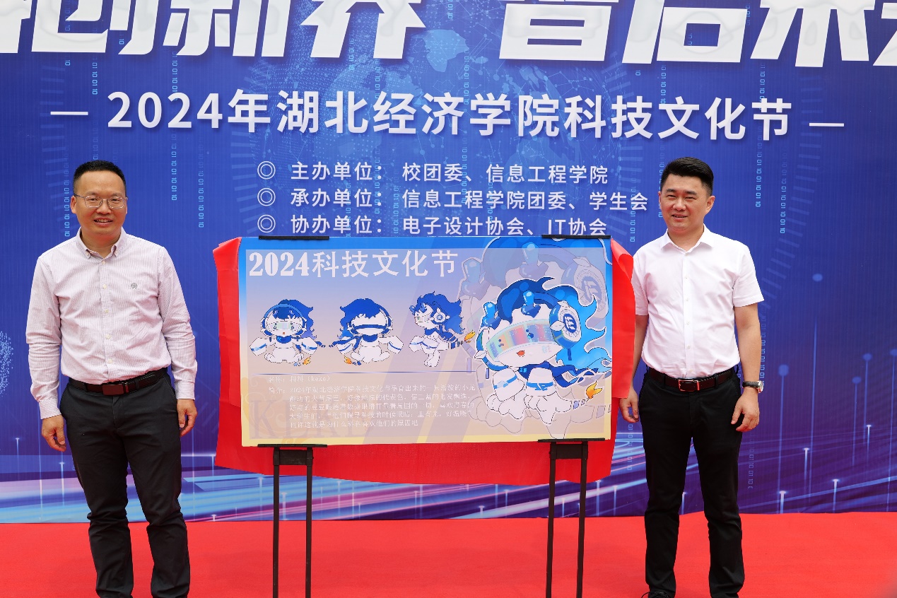 学生工作部(处)部长商守卫和365官网院长田浩共同为2024年科技文化节形象公仔揭幕
