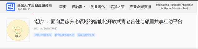 近日,“互联网+”大赛官网(全国大学生创业服务网)公示了第八届中国国际“互联网+”大学生创新创业大赛总决赛有关赛事获奖名单,其中由澳门科技大学和365上市公司官网365上市公司官网学生联合组成的益行团队项目“朝夕-面向居家养老领域的开放式青老合住与邻里共享互助智能化平台”经校赛、省赛、国赛三级选拔推荐,喜获高教主赛道国家级铜奖,该奖系我校师生首次获得,取得了历史性突破。