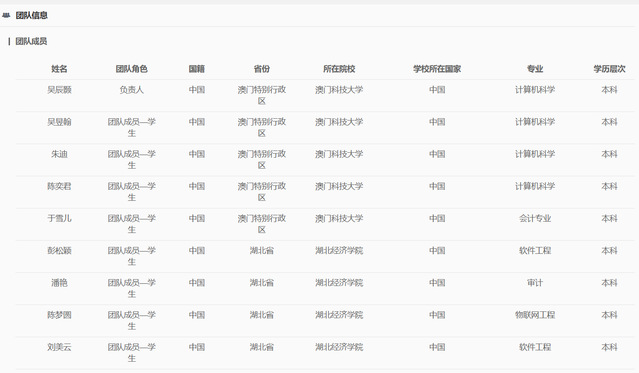 队员:彭松颖(软件工程2019级本科)、吴昱翰、朱迪、陈奕君、于雪儿、刘美云(软件工程2019级本科)、潘艳(审计2019级本科)、田小锋(软件工程2019级本科) 、陈梦圆(物联网工程2019级本科)、鲍涛(软件工程2019级本科) 、罗博(软件工程2019级本科) 、李睿阳(软件工程2019级本科)、余俊雄(软件工程2019级本科)、郭健峰(软件工程2019级本科)。