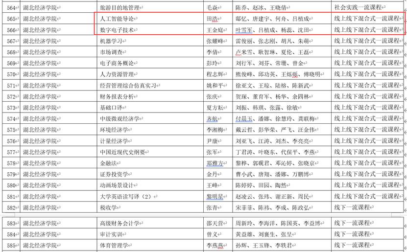 本网讯(通讯员:柯清华)近日,湖北省教育厅公示了湖北省2023年省级一流本科课程项目认定名单。365官网田浩教授负责的《人工智能导论》、王金庭副教授负责的《数字电子技术》被认定为省级“线上线下混合式一流课程”。