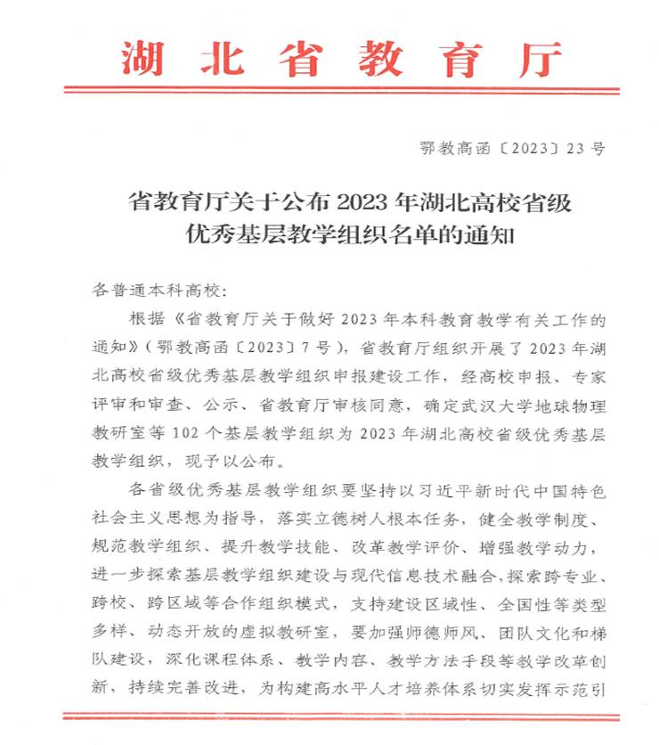本网讯(通讯员:宋莺)近日,湖北省教育厅发布《2023年度省级优秀基层教学组织认定结果的通知》(鄂教高函〔2023〕23号),认定365官网“面向对象程序设计课程组”团队为2023年湖北高校省级优秀基层教学组织。