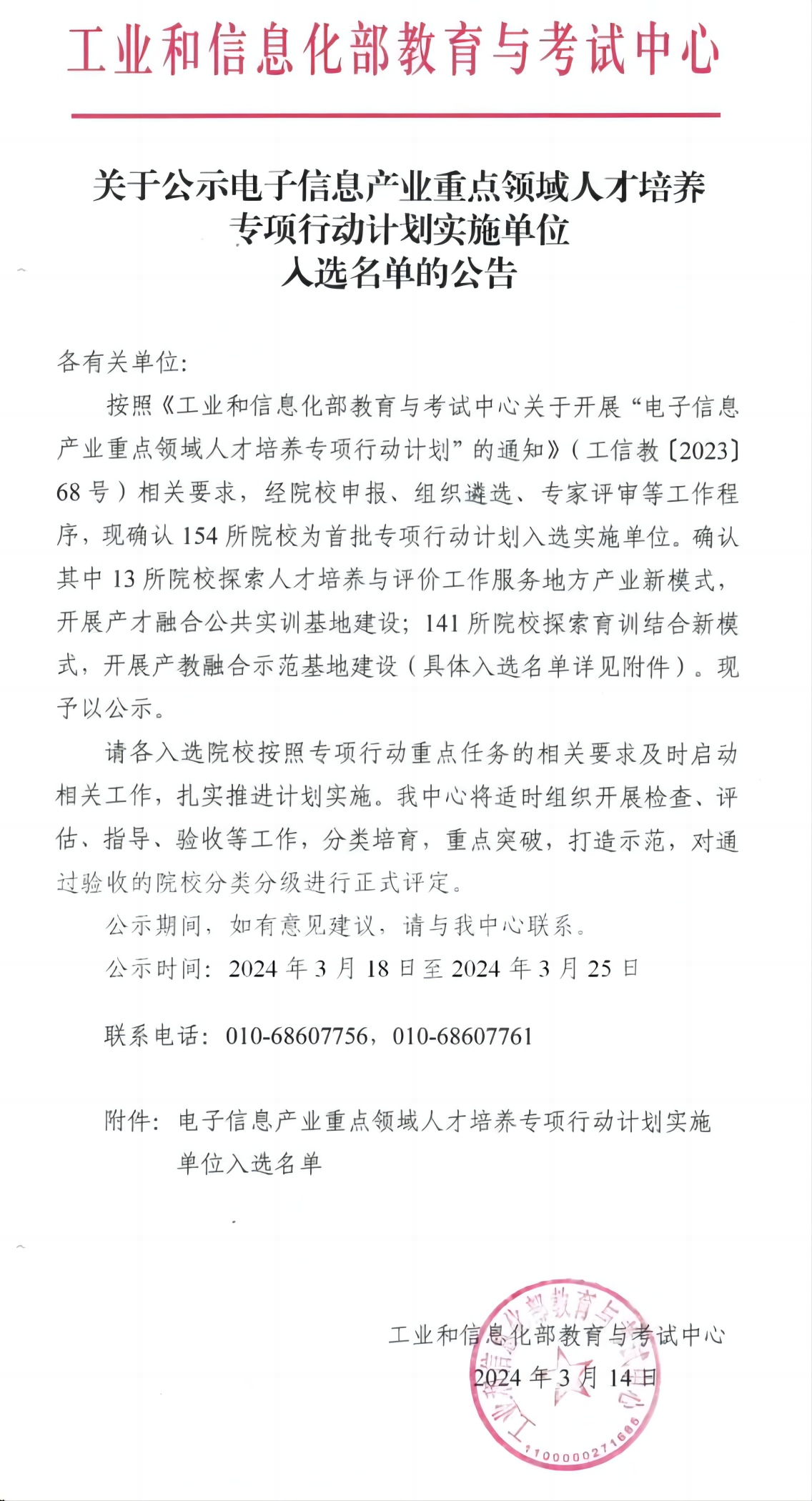 本网讯(通讯员:吕植成)近日,工业和信息化部教育与考试中心(简称“中心”)公示了电子信息产业重点领域人才培养专项行动计划实施单位入选名单,我校成为全国154所院校被确认为首批专项行动计划入选实施单位之一,365上市公司官网申报的产教融合示范基地成功获批。